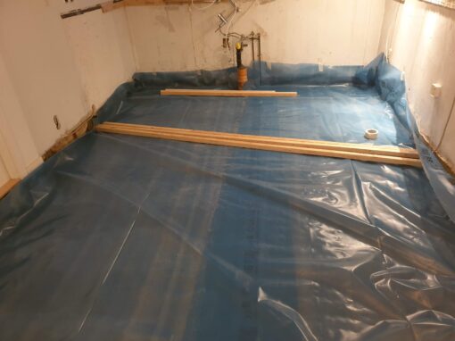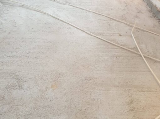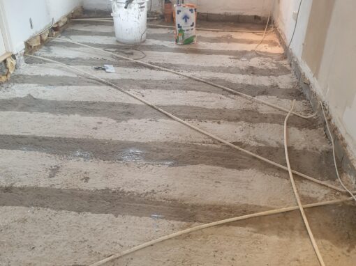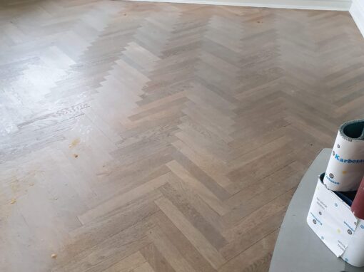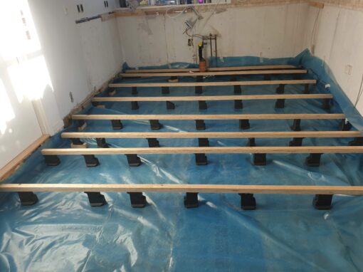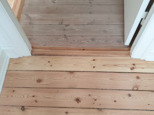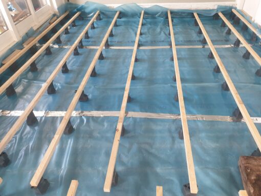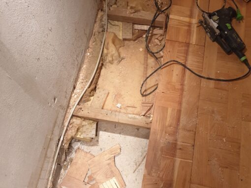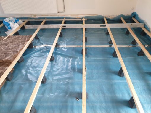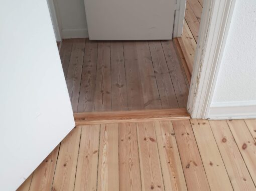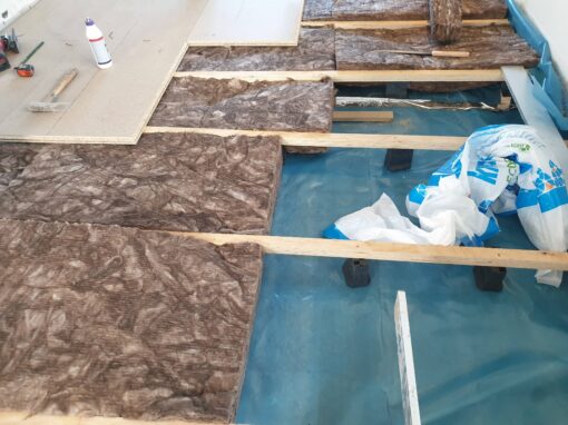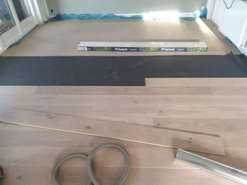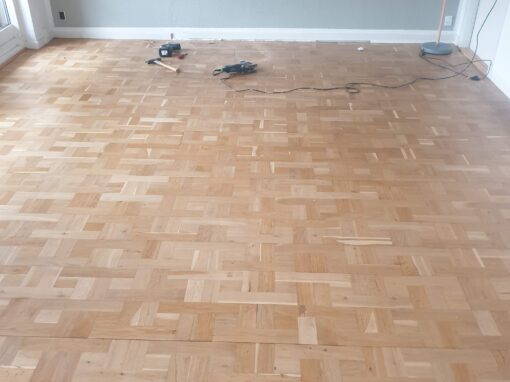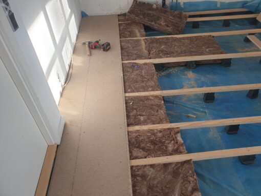 Afmontering eksisterende gulv, ny strøopbygning,montering af 22 mm spånpladegulv samt montering af 14 mm lamelplank.
